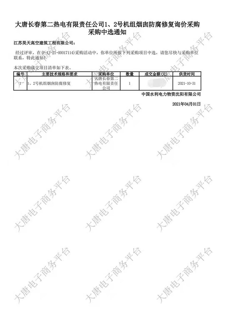 熱烈祝賀江蘇昊天高空在大唐長春第二熱煙囪防腐修復(fù)工程招投標(biāo)中脫穎而出